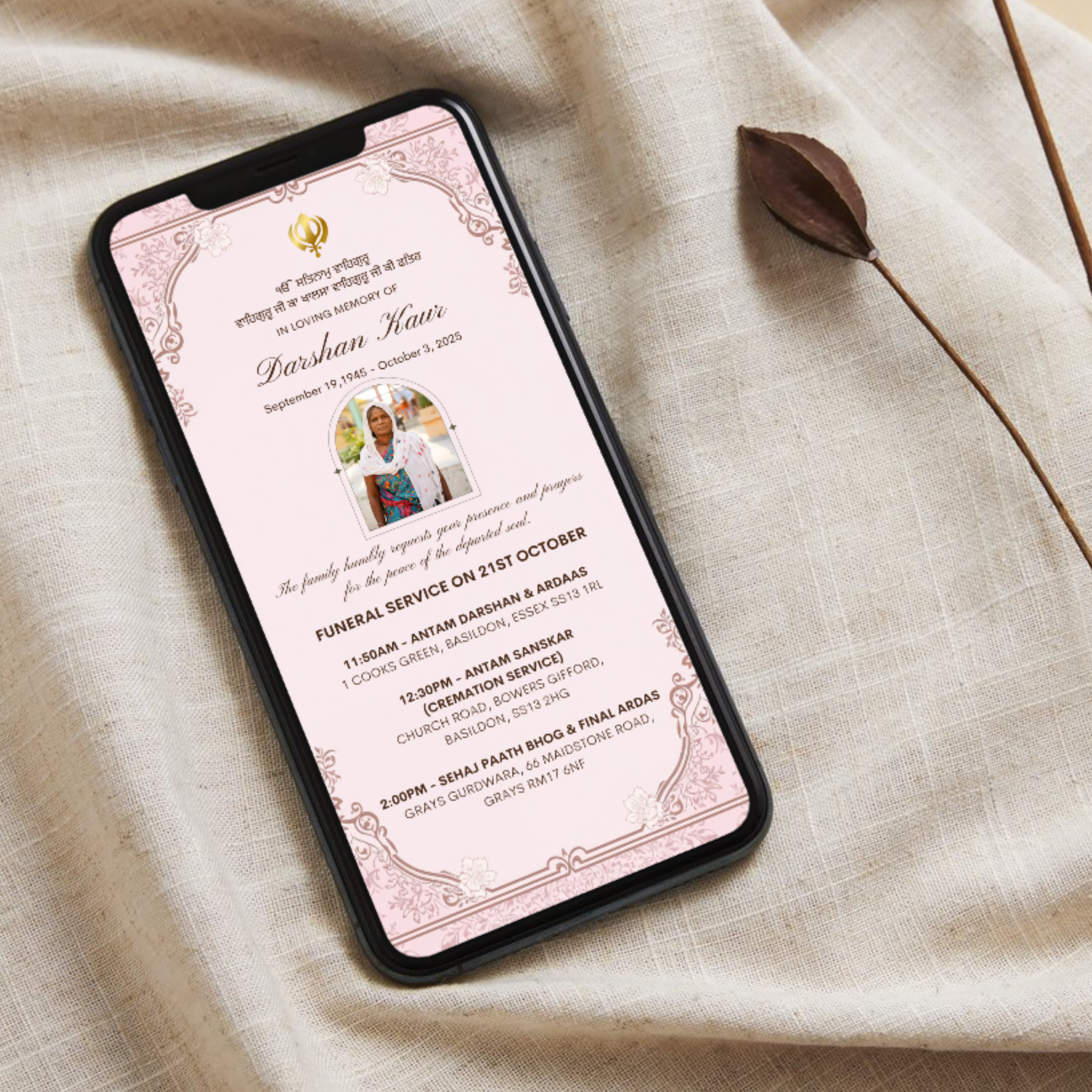 Commemorate with grace - this beautifully crafted digital funeral invitation from KraftyKaur.com is a gentle way to inform your guests of the service details for a beloved soul. Honour their memory and invite loved ones to share in the farewell.